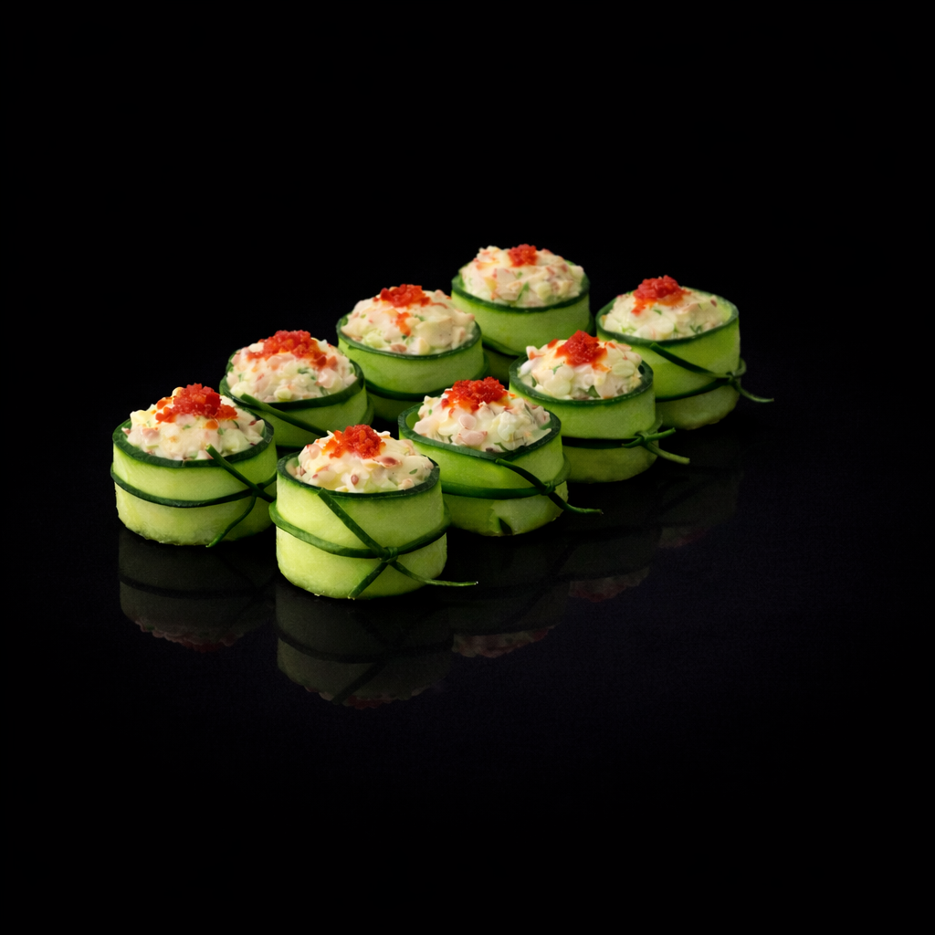 A rich and satisfying sushi roll made with seasoned rice and nori, filled with creamy cream cheese, avocado, fresh cucumber, and tender crab sticks, finished with smooth mayonnaise, delicate roe and tobiko, and a touch of chives for a refined, balanced flavor.